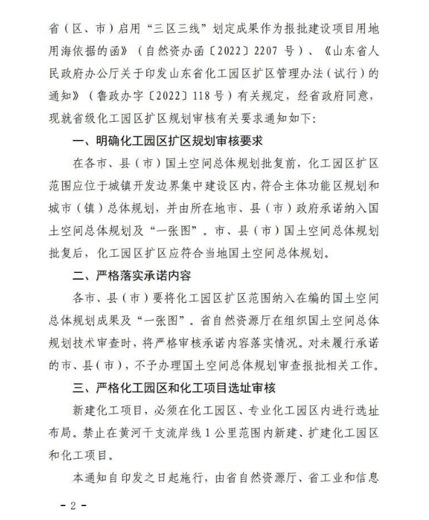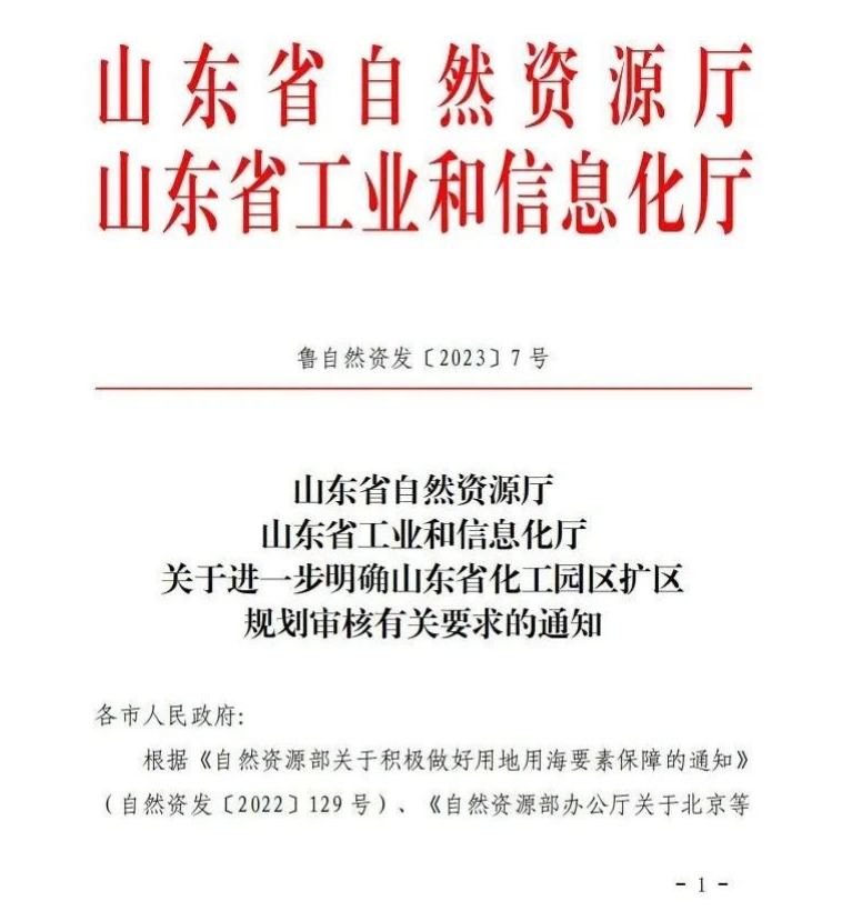 近日,山東省自然資源廳,山東省工業和信息化廳,發布《關于進一步明確山東省化工園區擴區規劃審核有關要求的通知》,通知明確化工園區擴區規劃審核要求,嚴格化工園區和化工項目選址審核要求。 化工園區擴區規劃審核,要求在各市、縣(市)國土空間總體規劃批復前,化工園區擴區范圍應位于城鎮開發邊界集中建設區內,符合主體功能區規劃和城市(鎮)總體規劃,并由所在地市、縣(市)政府承諾納入國土空間總體規劃及“一張圖”。市、縣(市)國土空間總體規劃批復后,化工園區擴區應符合當地國土空間總體規劃。