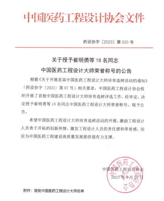 喜報!省醫工院崔明勇同志被授予中國醫藥工程設計大師榮譽稱號