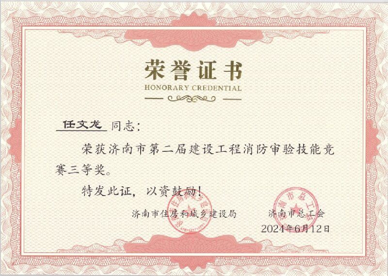 712日,由濟南市住房和城鄉建設局、濟南市總工會主辦的濟南市第二屆建設工程消防審驗技能競賽舉行了頒獎儀式,省醫工院員工任文龍榮獲競賽個人三等獎。