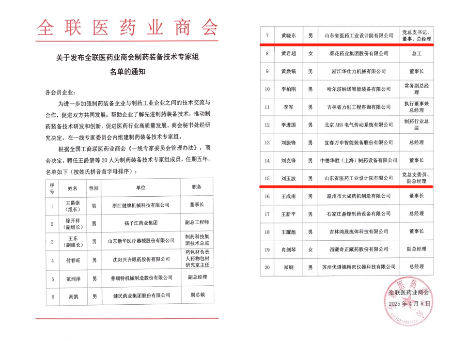 近日,中華全國工商業聯合會(以下簡稱“全國工商聯”)醫藥業商會公布了20人的制藥裝備技術專家組名單。山東省醫工院黨總支書記、董事、總經理黃曉東和黨總支委員、副總經理劉玉波被聘任為專家組成員。