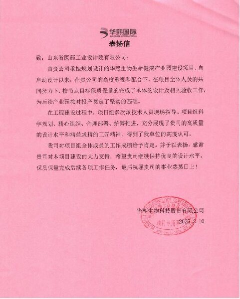 近日,山東省醫工院收到華熙生物科技股份有限公司贈送的錦旗和表揚信,對項目團隊高質高效的設計服務和精益求精的工匠精神表達誠摯謝意。