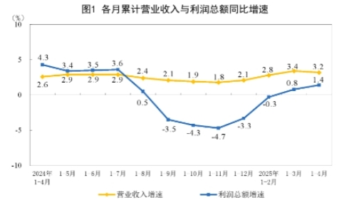 國家統計局5月發布了20251—4月份全國固定資產投資及規模以上工業企業利潤情況,據國家統計局投資司首席統計師羅毅飛與工業司統計師于衛寧介紹,1—4月份,全國固定資產投資(不含農戶)147024億元,同比增長4.0%,保持穩定增長;1-4月份規模以上工業企業營業收入保持增長,實現利潤總額21170.2億元,同比增長1.4%(按可比口徑計算)。